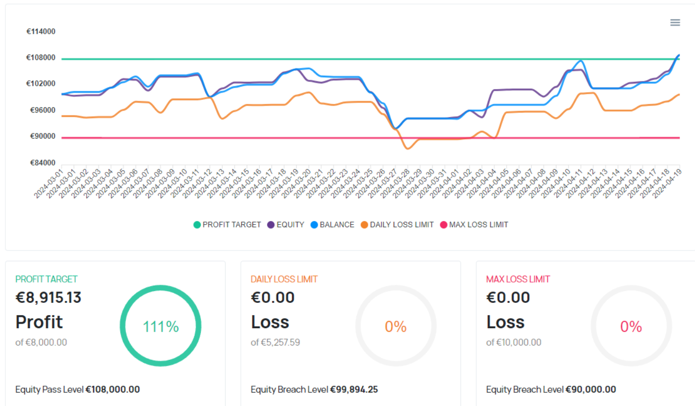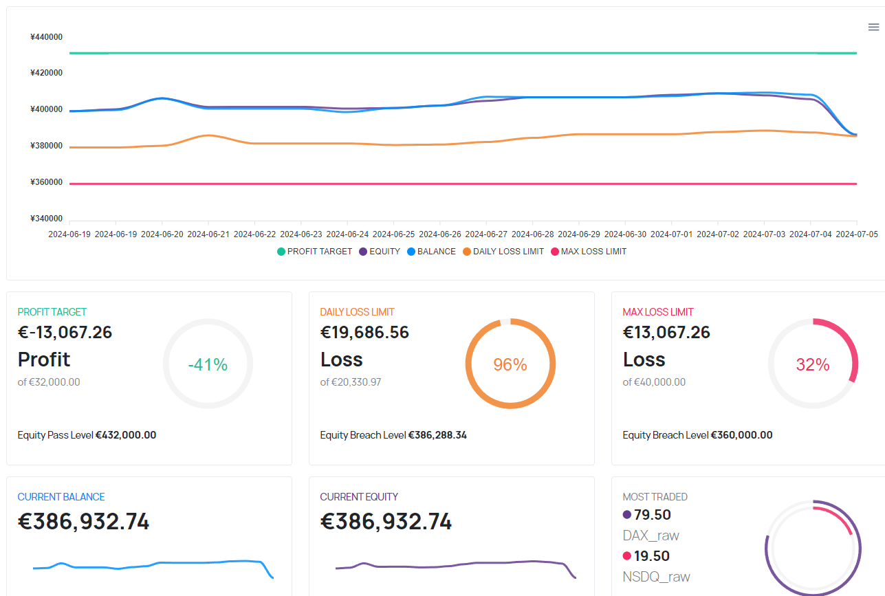 As of today, the €400K challenge account looks as follows: due to the proximity to the daily loss limit, I shouldn’t take any trades today. Pushing closer to that threshold is a razor’s edge I must avoid.
